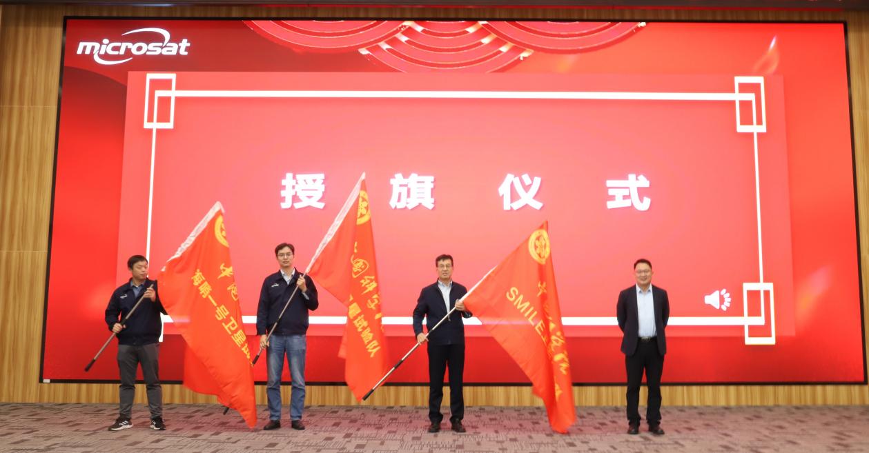 SMILE衛星系統總師李華旺、創新二十一號衛星副指揮常建平、海哨一號衛星技術負責人韓興博分別匯報了相關衛星研制進展及發射場工作安排。會議宣布了SMILE、創新二十一號衛星、海哨一號衛星責任專家任命,并授予三支衛星型號試驗隊隊旗、臨時黨支部旗幟。試驗隊隊員代表侍行劍、唐濤、錢玉琪相繼發言,表態將精誠團結,緊密協同,以高度的責任心履行好崗位職責。